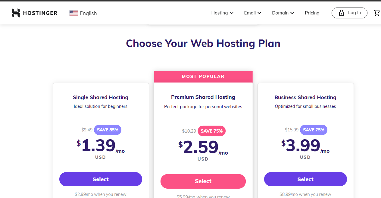 Hostinger offer four years of single shared hosting for $66.72, which comes out to $1.39 per month if you pay for all four years upfront. That’s an amazing deal. However, be aware that the very low price does not include a domain name or domain privacy. Despite that extra cost, the total upfront charge is lower than the others on the list. Even after the promotional pricing ends, the pricing is still very affordable. The single-site plan only costs $2.99 per month after renewal, one of the lowest rates in the industry. In fact, it’s about the same as Bluehost’s promotional pricing. The best part? Hostinger doesn’t feel like cheap hosting. From the marketing to the UI for managing your site, it’s a premium host with a deep roster of features on every plan.